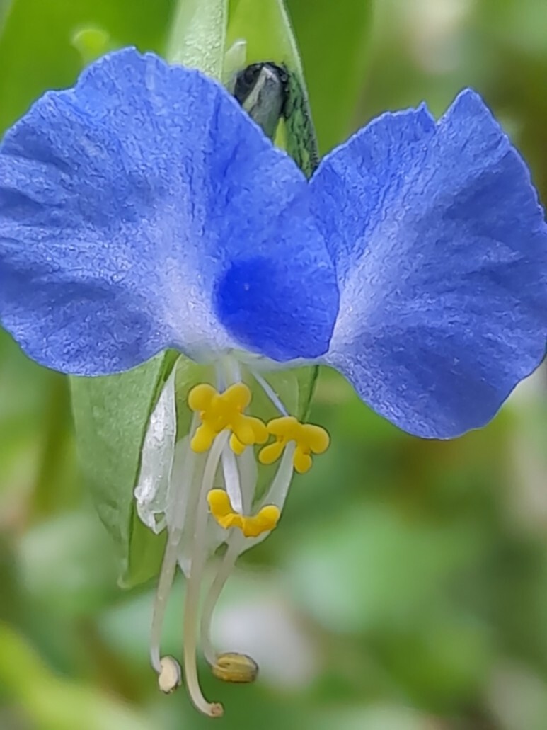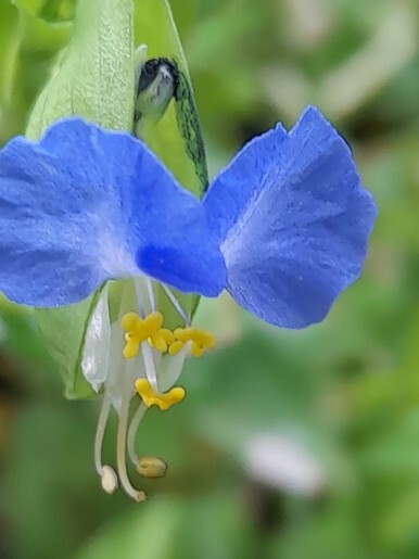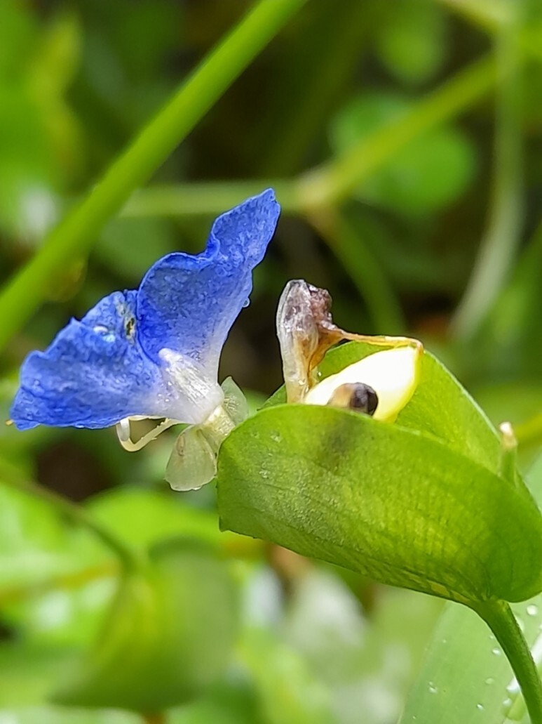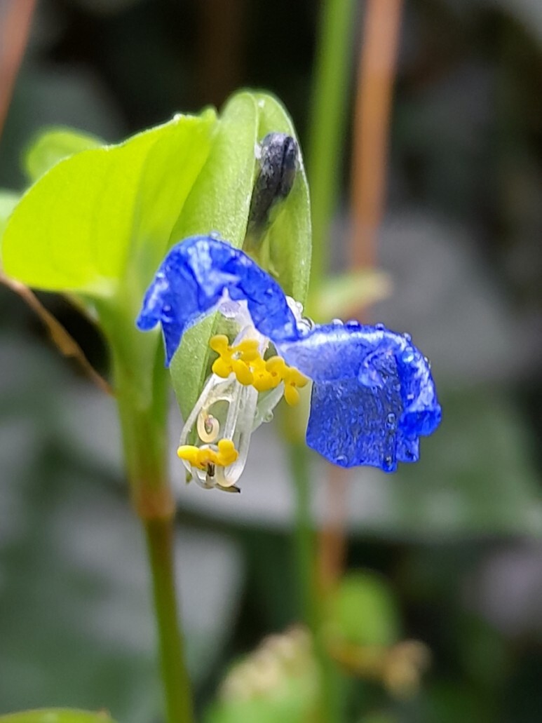 청색의 닭의장풀의 꽃은 특이하게 닭의 벼슬을 닮아